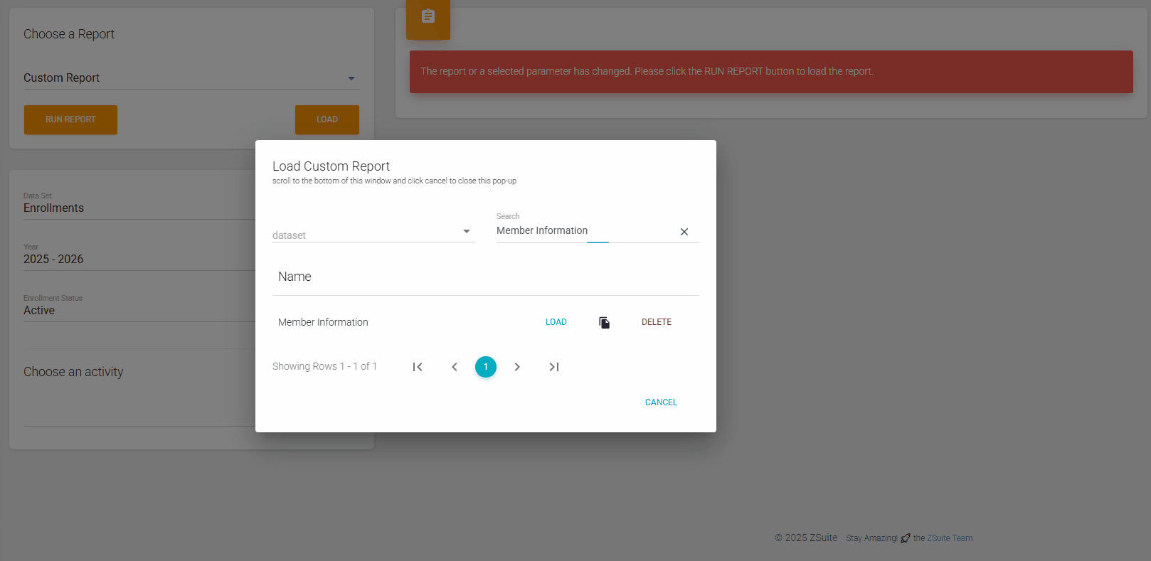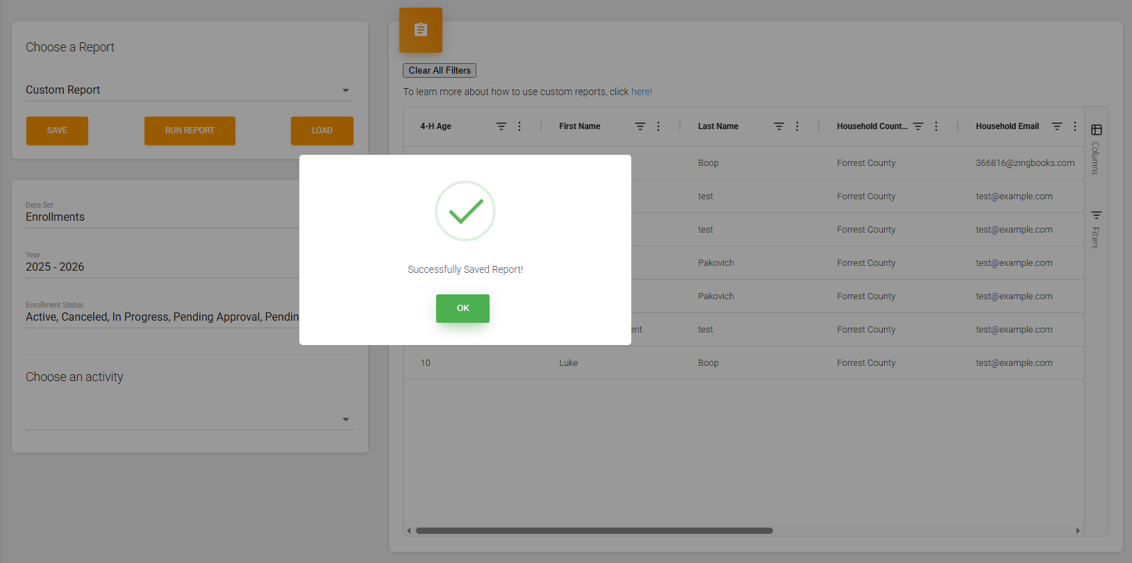 Once you find the custom report you saved that you want to load up, click the "Load" button and then it will load in the data into the report, no need to click "Run Report" with the pop-up closes: