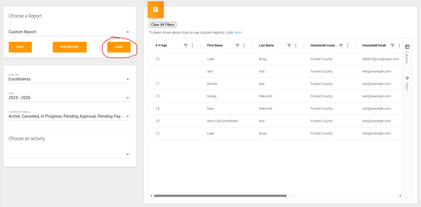 With your custom report saved you can access it and load it up by clicking the "Load" button: